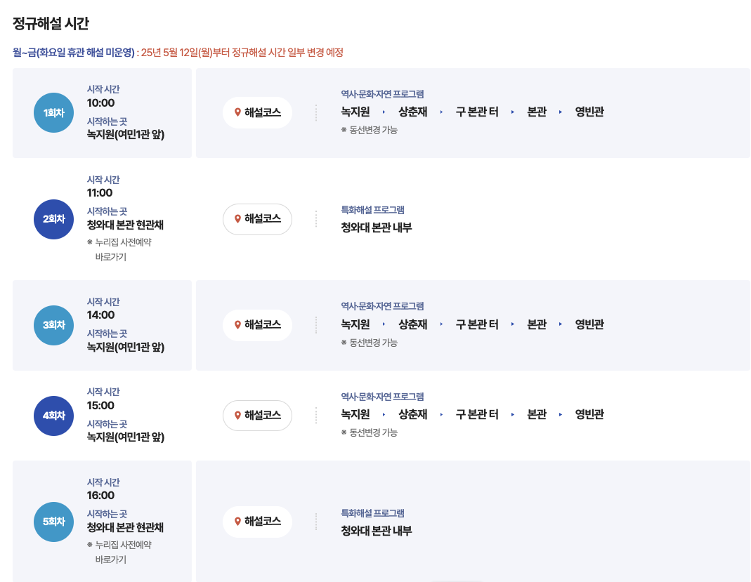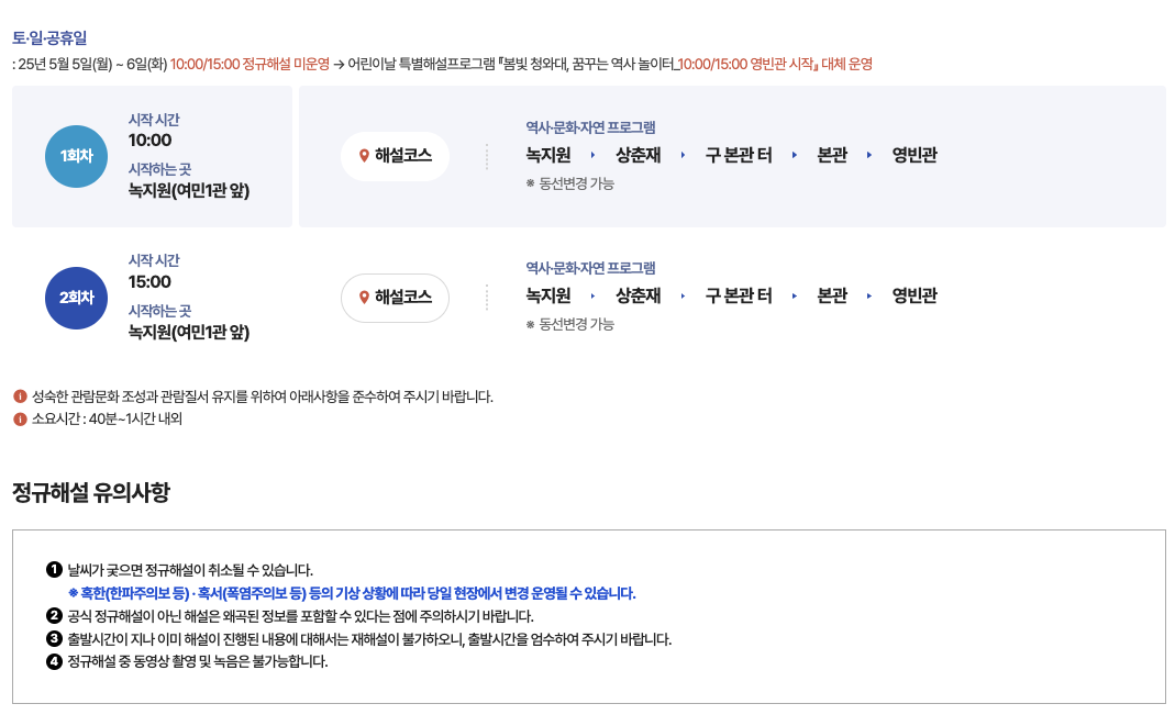 출발시간이 지나 이미 해설이 진행된 내용에 대해서는 재해설이 불가합니다. 출발시간을 엄수하여야 합니다.