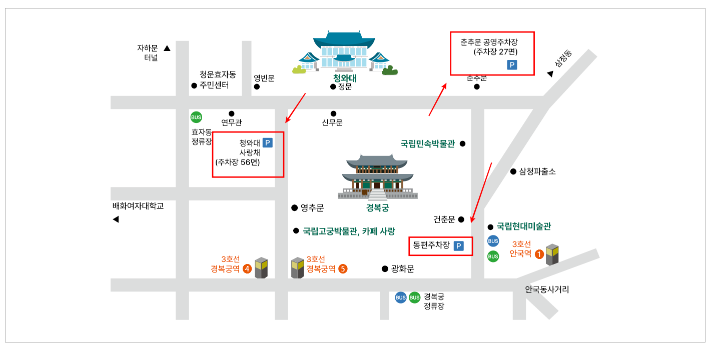 가급적 대중교통을 이용하시기 바라며, 승용차를 이용하는 경우에는 청와대 사랑채 주차장과 인근 공영 주차장을 이용하시기 바랍니다.