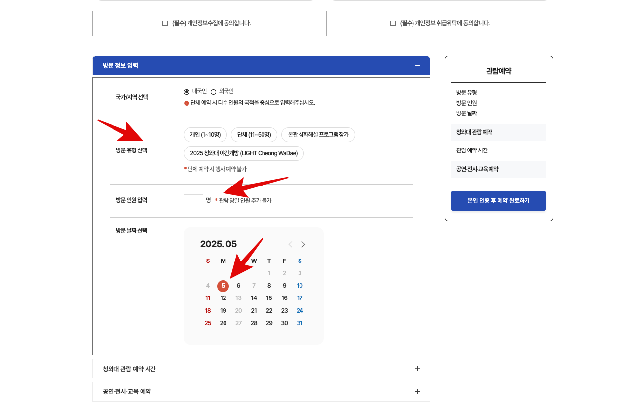 관람예약 링크에 접속해서 동의사항 모두 체크하고 방문유형, 방문인원, 방문날짜를 선택합니다.